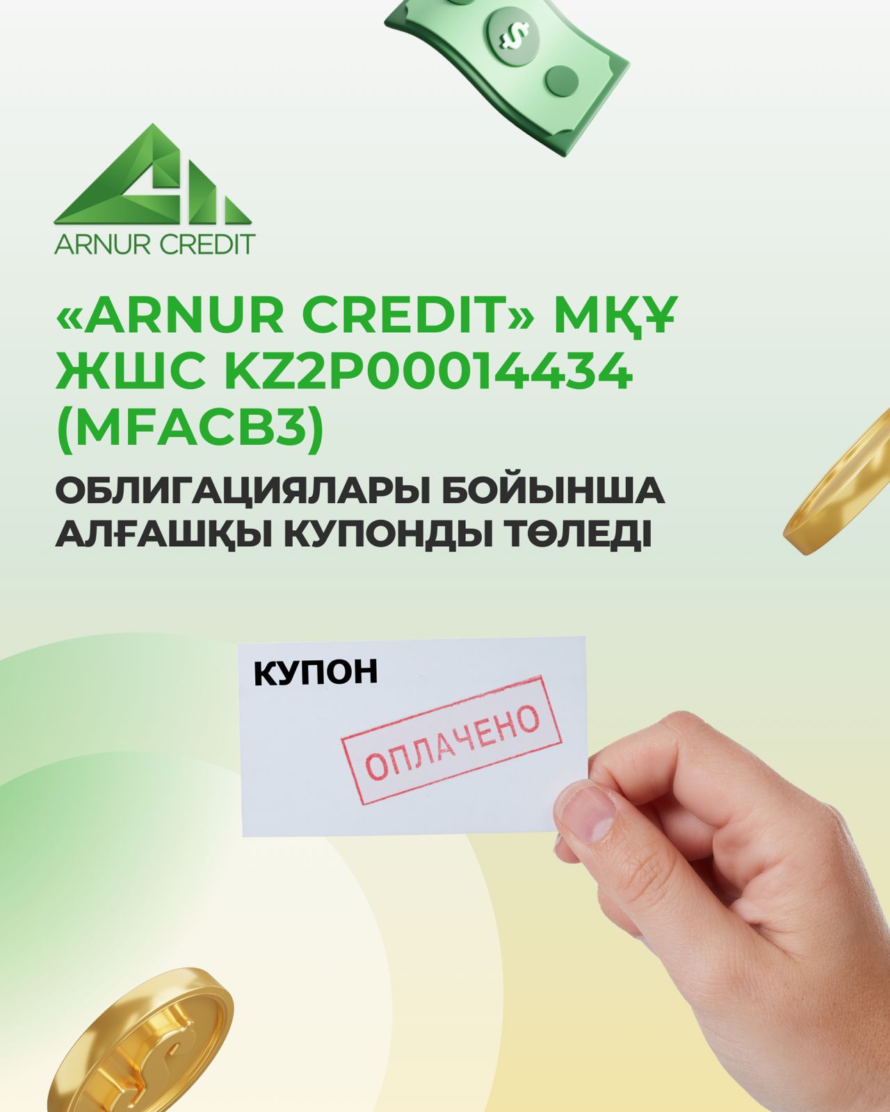 «ARNUR CREDIT» МҚҰ ЖШС KZ2P00014434 (MFACB3) Облигациялары бойынша алғашқы купонды төледі