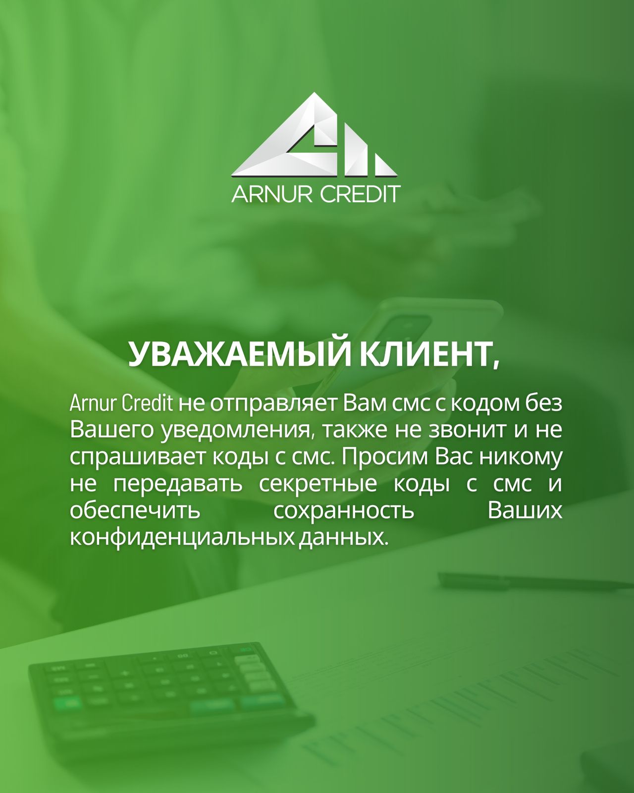 ArnurCredit никогда не отправляет SMS-коды без вашего разрешения и не запрашивает у вас коды по телефону.